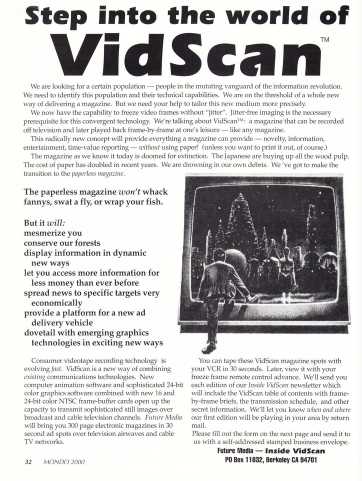 Vidscan, a paperless magazine that can be recorded off television - ads on Mondo 2000 issue 1 (1989)